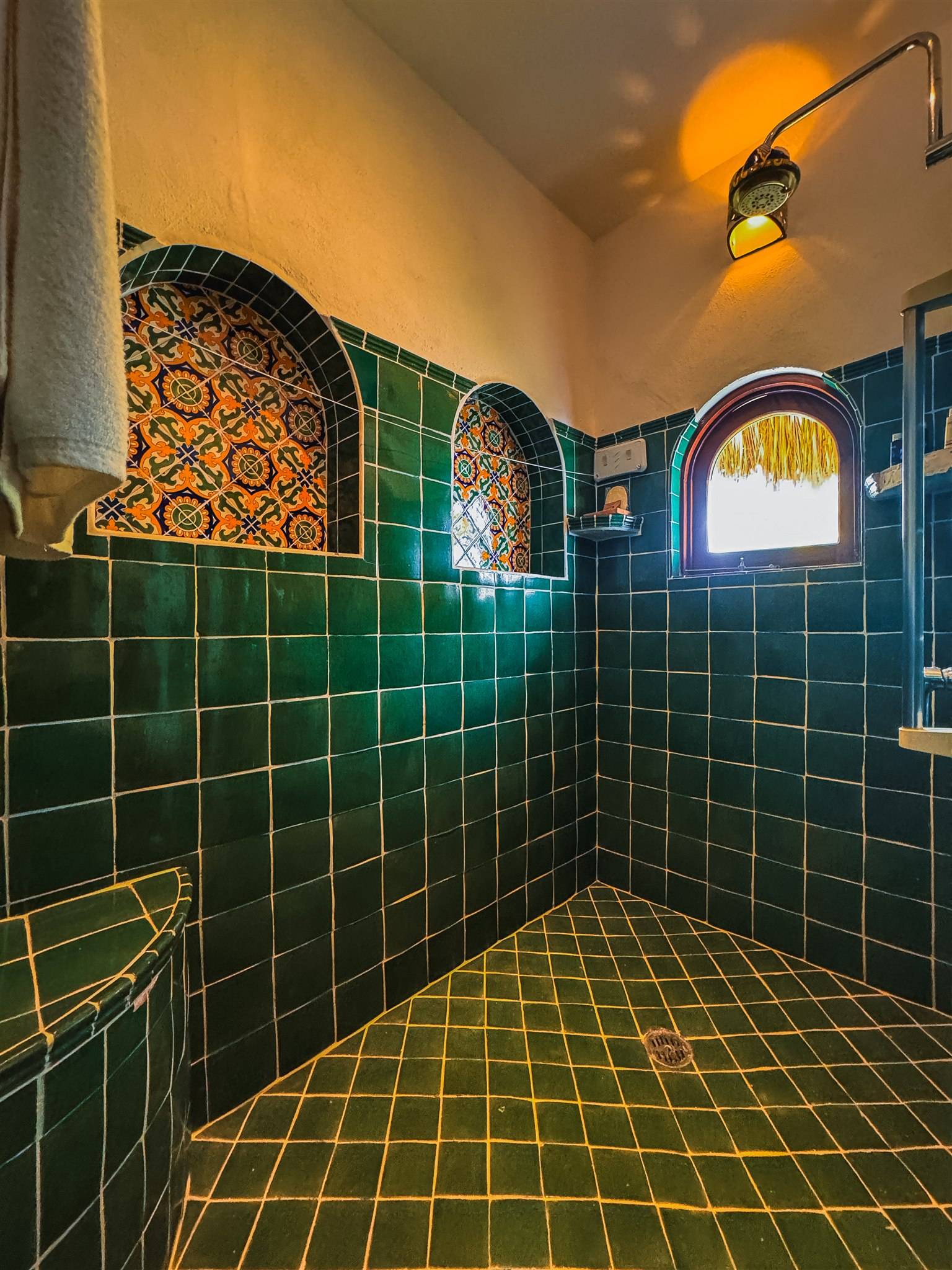 • Oversized shower with natural stone mosaics